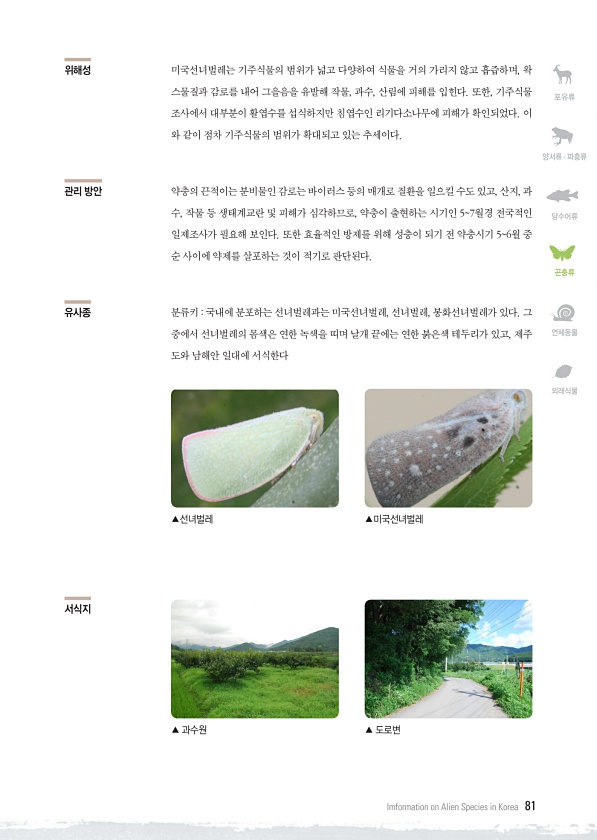 포유류 양서류 · 파충류 담수어류 곤충류 연체동물 외래식물 Imformation on Alien Species in Korea 81 위해성 미국선녀벌레는 기주식물의 범위가 넓고 다양하여 식물을 거의 가리지 않고 흡즙하며, 왁 스물질과 감로를 내어 그을음을 유발해 작물, 과수, 산림에 피해를 입힌다. 또한, 기주식물 조사에서 대부분이 활엽수를 섭식하지만 침엽수인 리기다소나무에 피해가 확인되었다. 이 와 같이 점차 기주식물의 범위가 확대되고 있는 추세이다. 관리 방안 약충의 끈적이는 분비물인 감로는 바이러스 등의 매개로 질환을 일으킬 수도 있고, 산지, 과 수, 작물 등 생태계교란 및 피해가 심각하므로, 약충이 출현하는 시기인 57월경 전국적인 일제조사가 필요해 보인다. 또한 효율적인 방제를 위해 성충이 되기 ...