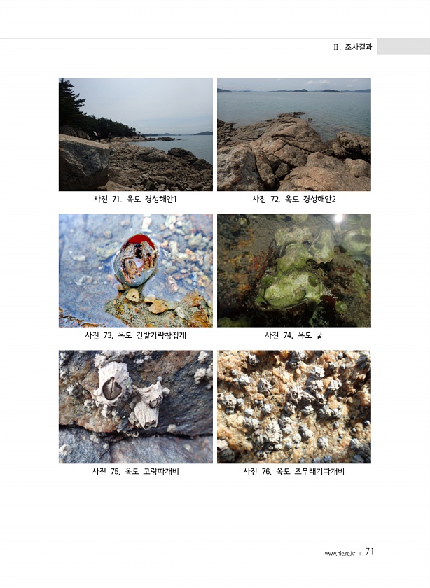 Ⅱ. 조사결과 www.nie.re.kr ? 71 사진 71. 옥도 경성해안1 사진 72. 옥도 경성해안2 사진 73. 옥도 긴발가락참집게 사진 74. 옥도 굴 사진 75. 옥도 고랑따개비 사진 76. 옥도조무래기따개비