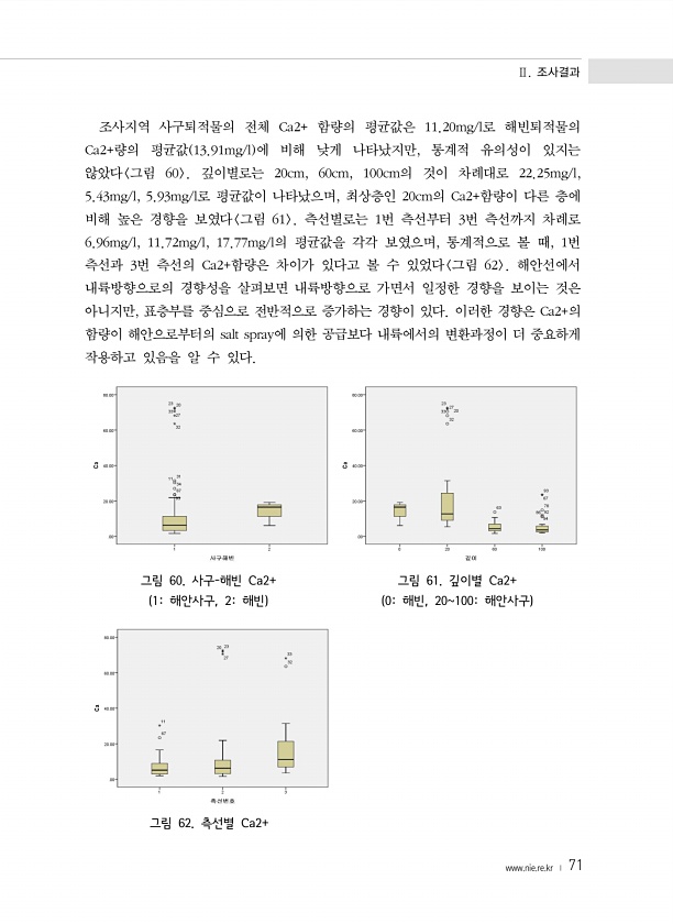 Ⅱ. 조사결과 www.nie.re.kr ? 71 조사지역 사구퇴적물의 전체 Ca2+ 함량의 평균값은 11.20mg/l로 해빈퇴적물의 Ca2+량의 평균값 13.91mg/l 에 비해 낮게 나타났지만, 통계적 유의성이 있지는 않았다 그림 60 깊이별로는 20cm, 60cm, 100cm의 것이 차례대로 22.25mg/l, 5.43mg/l, 5.93mg/l로 평균값이 나타났으며, 최상층인 20cm의 Ca2+함량이 다른 층에 비해 높은 경향을 보였다 그림 61 측선별로는 1번 측선부터 3번 측선까지 차례로 6.96mg/l, 11.72mg/l, 17.77mg/l의 평균값을 각각 보였으며, 통계적으로 볼 때, 1번 측선과 3번 측선의 Ca2+함량은 차이가 있다고 볼 수 있었다 그림 62 해안선에서 내륙방향으로의 경향성을 ...