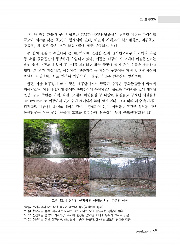 Ⅱ. 조사결과 www.nie.re.kr ? 69 그러나 하천 흐름과 수직방향으로 발달한 절리나 단층선이 위치한 지점을 따라서는 폭포나 뢰 瀨; 낮은 폭포 가 형성되어 있다. 대표적 사례로서 학소대폭포, 비룡폭포, 쌍폭포, 제1폭포 등은 모두 학심이골에 집중 분포하고 있다. 두 번째 물질적 측면에서 볼 때, 하도에 인접한 산지 급사면으로부터 거력과 자갈 등 측방 공급물질이 풍부하게 유입되고 있다. 이들은 직경이 커 모래나 미립물질과는 달리 쉽게 이동되지 않아 홍수시를 제외하면 하상 곳곳에 쌓여 유수 흐름을 방해하고 있다. 그 결과 학심이골, 심심이골, 천문지골 등 최상류 구간에는 거력 및 자갈하상의 발달이 탁월하다. 이로 인하여 기반암이 노출된 하상은 연속성이 떨어진다. 한편 지난 최후빙기 때 이곳은 배후산지...