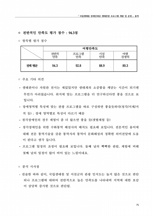 ?국립생태원 장애인대상 생태관광 프로그램 개발 및 운영? 용역 75 ? 전반적인 만족도 평가 점수 94.3점 ? 항목별 평가 점수 여행만족도 전반적 만족 프로그램 만족 시설 만족 여행 경쟁력 전체 평균 94.3 92.8 88.9 89.3 ? 주요 기타 의견 생태관이나 자원관 전시는 재밌었지만 생태계의 소중함을 깨닫는 시간이 되기엔 무언가 아쉬웠습니다. 취지에 맞는 프로그램을 더 연구하신다면 좋을 것으로 보 입니다. 장애영역별 특성에 맞는 관광 프로그램을 따로 구성하면 좋을듯하다 청각/지체/지 적 등 ; 장애 영역별로 특성이 다르기 때문 청각장애인의 경우 체험이 좀 더 많으면 좋을 듯 갯벌체험 등 청각장애인을 위한 수화통역 해설사의 배치도 필요해 보입니다. 전문적인 용어에 대해 전문 통역기술을 갖춘 통역사의 ...