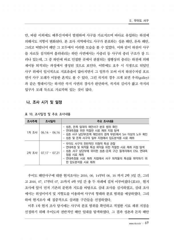 Ⅱ. 우이도 사구 www.nie.re.kr ? 69 만, 바람 이외에도 배후산지에서 발원하여 사구를 가로지르며 바다로 유입하는 하천에 의해서도 지형이 변화된다. 본 조사 지역에서도 사구가 분포하는 성촌 해안, 돈목 해안, 그리고 띠밭너머 해안 그 모두에서 이러한 모습을 볼 수 있었다. 이와 같이 하천이 사구 를 자르듯 침식하며 흘러내리는 하안 사면에서는 사층리 등 사구의 층리 구조가 잘 드 러나 있는데, 그 중 하안에 바로 인접한 곳에서 관찰되는 평행상의 층리는 하천에 의해 재이동 퇴적되는 과정에서 생성된 것으로 보인다. 이밖에도 호우 시 식생으로 뒤덮인 사구 위에서 일시적으로 지표유출이 많아지면서 그 일부가 모여 마치 하천수처럼 흐르 면서 사구 모래가 이동한 흔적도 볼 수 있다. 그런 곡지의 경우 크게 보...