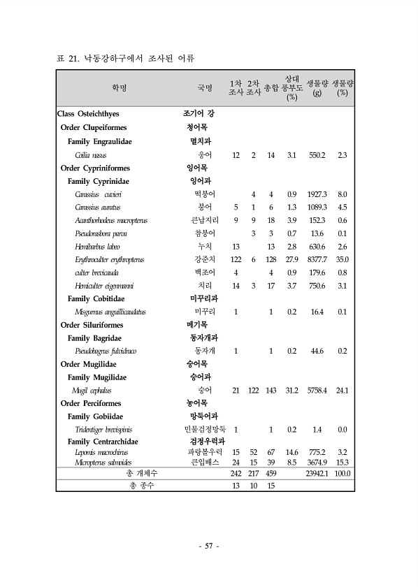 57 학명 국명 1차 조사 2차 조사 총합 상대 풍부도 % 생물량 g 생물량 % Class Osteichthyes 조기어 강 Order Clupeiformes 청어목 Family Engraulidae 멸치과 Coilia nasus 웅어 12 2 14 3.1 550.2 2.3 Order Cypriniformes 잉어목 Family Cyprinidae 잉어과 Carassius cuvieri 떡붕어 4 4 0.9 1927.3 8.0 Carassius auratus 붕어 5 1 6 1.3 1089.3 4.5 Acanthorhodeus macropterus 큰납지리 9 9 18 3.9 152.3 0.6 Pseudorasbora parva 참붕어 3 3 0.7 13.6 0.1 Hemibarbus labeo 누치 13 ...