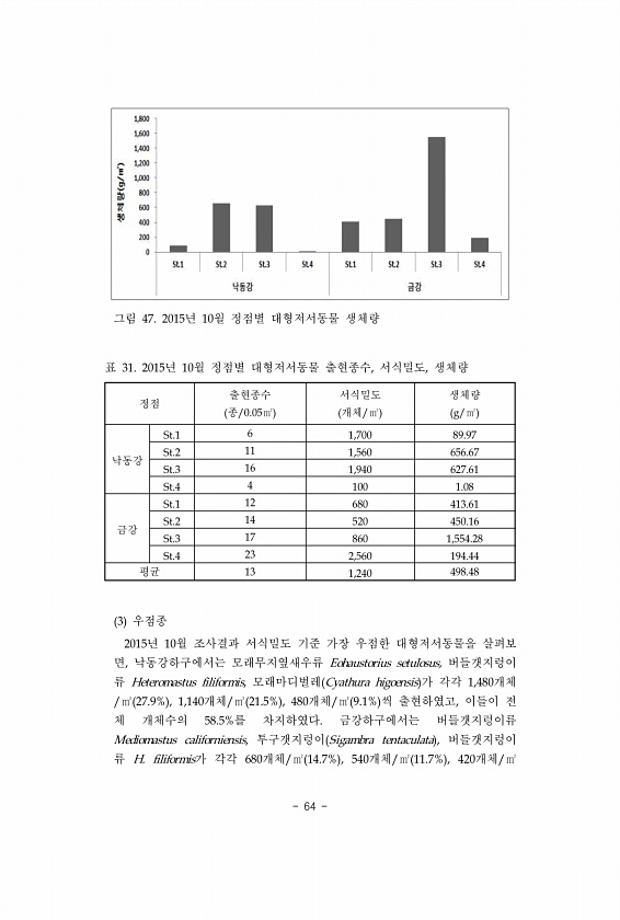 64 그림 47. 2015년 10월 정점별 대형저서동물 생체량 정점 출현종수 종/0.05㎡ 서식밀도 개체/㎡ 생체량 g/㎡ 낙동강 St.1 6 1,700 89.97 St.2 11 1,560 656.67 St.3 16 1,940 627.61 St.4 4 100 1.08 금강 St.1 12 680 413.61 St.2 14 520 450.16 St.3 17 860 1,554.28 St.4 23 2,560 194.44 평균 13 1,240 498.48 표 31. 2015년 10월 정점별 대형저서동물 출현종수, 서식밀도, 생체량 3 우점종 2015년 10월 조사결과 서식밀도 기준 가장 우점한 대형저서동물을 살펴보 면, 낙동강하구에서는 모래무지옆새우류 Eohaustorius setulosus, 버들갯지렁이 류 Het...