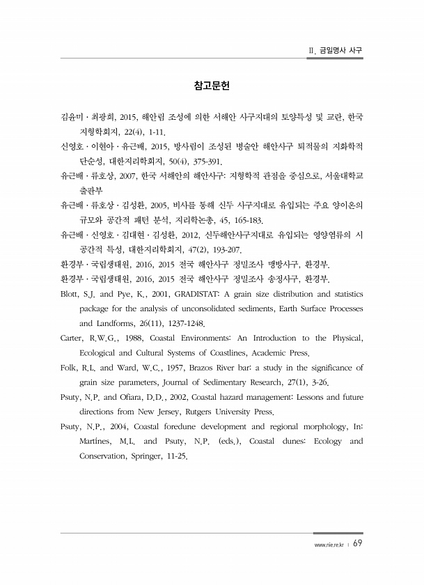 Ⅱ. 금일명사 사구 www.nie.re.kr ? 69 참고문헌 김윤미·최광희, 2015, 해안림 조성에 의한 서해안 사구지대의 토양특성 및 교란, 한국 지형학회지, 22 4 , 1-11. 신영호·이현아·유근배, 2015, 방사림이 조성된 병술안 해안사구 퇴적물의 지화학적 단순성, 대한지리학회지, 50 4 , 375-391. 유근배·류호상, 2007, 한국 서해안의 해안사구지형학적 관점을 중심으로, 서울대학교 출판부 유근배·류호상·김성환, 2005, 비사를 통해 신두 사구지대로 유입되는 주요 양이온의 규모와 공간적 패턴 분석, 지리학논총, 45, 165-183. 유근배·신영호·김대현·김성환, 2012, 신두해안사구지대로 유입되는 영양염류의 시 공간적 특성, 대한지리학회지, 47 2 , 193-207. 환경부·...
