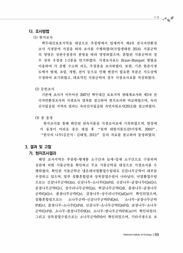 식 생 National Institute of EcologyⅠ69 다. 조사방법 1 현지조사 백두대간보호지역을 대상으로 추풍령에서 밀재까지 제4차 전국자연환경 조사 식생분야 지침을 따라 조사를 수행하였다 국립생태원 2014 식물군락 의 명명은 상관우점종의 종명을 따라 명명하였으며, 혼합된 식물군락의 경 우 상위 우점종 12종을 연기하였다. 식생조사표는 Braun-Blanquet 방법을 이용하여 각 층별 수고와 피도, 우점종을 조사하였다. 또한, 기존 현존식생 도에서 벌채, 조림, 개발, 천이 등으로 인해 변경이 필요한 부분은 지도상에 수정하여 표기하였고, 대표적인 식물군락의 경우 식생조사표를 작성하였다. 2 문헌조사 기존에 조사가 이루어진 2007년 백두대간 보호지역 생태계조사와 제3차 전 국자연환경조사의 ...