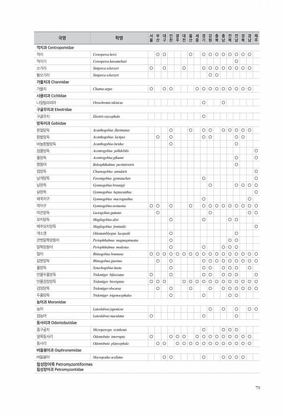 79 꺽지과 Centropomidae 꺽지 Coreoperca herzi ○ ○ ○ ○ ○ ○ ○ ○ ○ ○ ○ 꺽저기 Coreoperca kawamebari ○ 쏘가리 Siniperca scherzeri ○ ○ ○ ○ ○ ○ ○ ○ ○ ○ ○ 황쏘가리 Siniperca scherzeri ○ ○ 가물치과 Channidae 가물치 Channa argus ○ ○ ○ ○ ○ ○ ○ ○ ○ ○ ○ ○ 시클리과 Cichlidae 나일틸라피아 Oreochromis niloticus ○ ○ 구굴무치과 Eleotridae 구굴무치 Eleotris oxycephala ○ 망둑어과 Gobiidae 문절망둑 Acanthogobius favimanus ○ ○ ○ ○ ○ ○ ○ ○ ○ 흰발망둑 Acanthogobius lactip...