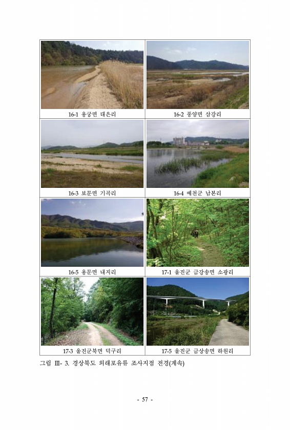16-1 용궁면 대은리 16-2 풍양면 삼강리 16-3 보문면 기곡리 16-4 예천군 남본리 16-5 용문면 내지리 17-1 울진군 금강송면 소광리 17-3 울진군북면 덕구리 17-5 울진군 금상송면 하원리 그림 Ⅲ- 3. 경상북도 외래포유류 조사지점 전경 계속 57