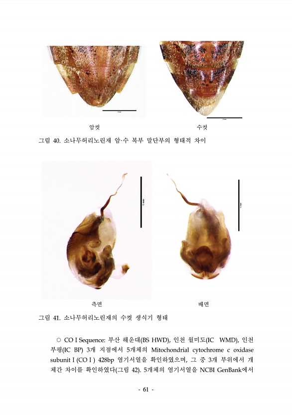61 암컷 수컷 그림 40. 소나무허리노린재 암·수 복부 말단부의 형태적 차이 측면 배면 그림 41. 소나무허리노린재의 수컷 생식기 형태 ○ COⅠSequence부산 해운대 BS HWD , 인천 월미도 IC WMD , 인천 부평 IC BP 3개 지점에서 5개체의 Mitochondrial cytochrome c oxidase subunitⅠ COⅠ 428bp 염기서열을 확인하였으며, 그 중 3개 부위에서 개 체간 차이를 확인하였다 그림 42 5개체의 염기서열을 NCBIGenBank에서