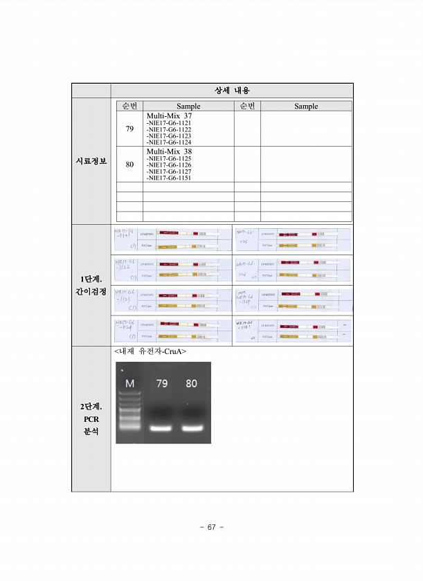 67 상세 내용 시료정보 순번 Sample 순번 Sample 79 Multi-Mix 37 -NIE17-G6-1121 -NIE17-G6-1122 -NIE17-G6-1123 -NIE17-G6-1124 80 Multi-Mix 38 -NIE17-G6-1125 -NIE17-G6-1126 -NIE17-G6-1127 -NIE17-G6-1151 1단계. 간이검정 2단계. PCR 분석 내재 유전자-CruA