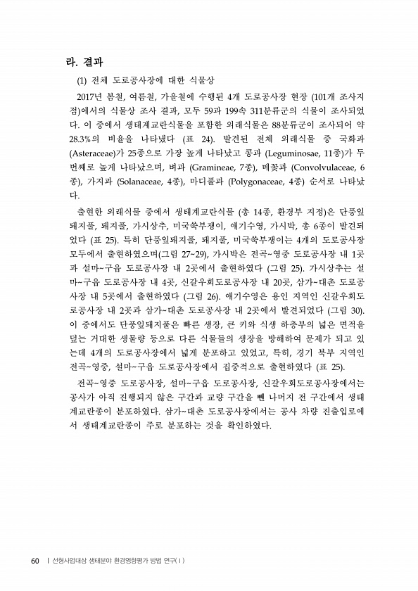 라 결과 전체 도로공사장에 대한 식물상 년 봄철 여름철 가을철에 수행된 개 도로공사장 현장 개 조사지 점 에서의 식물상 조사 결과 모두 과 속 분류군의 식물이 조사되었 다 이 중에서 생태계교란식물을 포함한 외래식물은 분류군이 조사되어 약 의 비율을 나타냈다 표 발견된 전체 외래식물 중 국화과 가 종으로 가장 높게 나타났고 콩과 종 가 두 번째로 높게 나타났으며 벼과 종 메꽃과 종 가지과 종 마디풀과 종 순서로 나타났 다 출현한 외래식물 중에서 생태계교란식물 총 종 환경부 지정 은 단풍잎 돼지풀 돼지풀 가시상추 미국쑥부쟁이 애기수영 가시박 총 종이 발견되 었다 표 특히 단풍잎돼지풀 돼지풀 미국쑥부쟁이는 개의 도로공사장 모두에서 출현하였으며 그림 가시박은 전곡 영중 도로공사장 내 곳 과 설마 구읍 도로공사장 내...