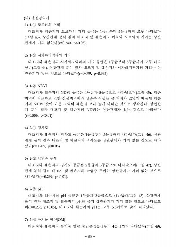1 1-① ? 1 ? 5 ?? ? ? ? 43 r=0.240, p 0.05 2 1-② ? 1 ? 5 ?? ? ? ? 44 ? ?r=0.099, p=0.333 3 1-③ NDVI NDVI ? 4 ? 5 ? ? ? ? 45 , ? NDVI ? ? NDVI ? ? r=0.556, p 0.01 4 2-① ? 1 ? 5 ? ?? ? ? 46 ? ?r=0.205, p 0.05 ? ? ②-5 2 ? 2 ? 3 ? ? ? ? 47 , ? ? ? ?r=0.299, p 0.01 6 2-③ pH pH ? 1 ? 3 ? ? ? ? 48 pH ? ? r=0.253, p 0.05 , pH 5.6 ? ? ? 7 2-④ ? OM ? ? 1 ? 4 ? ?? ? ? 49