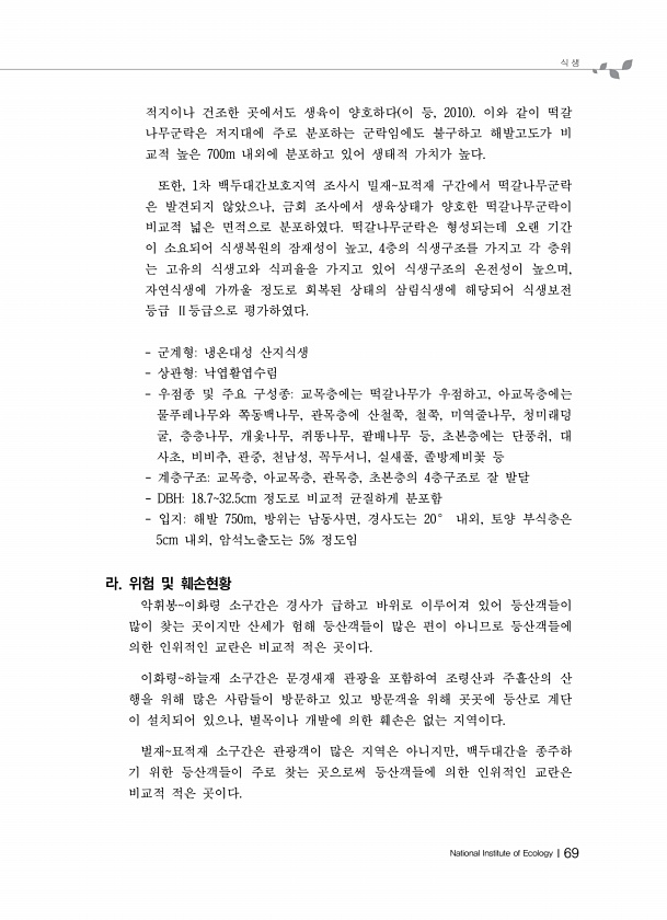 식 생 National Institute of EcologyⅠ69 적지이나 건조한 곳에서도 생육이 양호하다 이 등, 2010 이와 같이 떡갈 나무군락은 저지대에 주로 분포하는 군락임에도 불구하고 해발고도가 비 교적 높은 700m 내외에 분포하고 있어 생태적 가치가 높다. 또한, 1차 백두대간보호지역 조사시 밀재묘적재 구간에서 떡갈나무군락 은 발견되지 않았으나, 금회 조사에서 생육상태가 양호한 떡갈나무군락이 비교적 넓은 면적으로 분포하였다. 떡갈나무군락은 형성되는데 오랜 기간 이 소요되어 식생복원의 잠재성이 높고, 4층의 식생구조를 가지고 각 층위 는 고유의 식생고와 식피율을 가지고 있어 식생구조의 온전성이 높으며, 자연식생에 가까울 정도로 회복된 상태의 삼림식생에 해당되어 식생보전 등급 Ⅱ등급으로 평가하였다...
