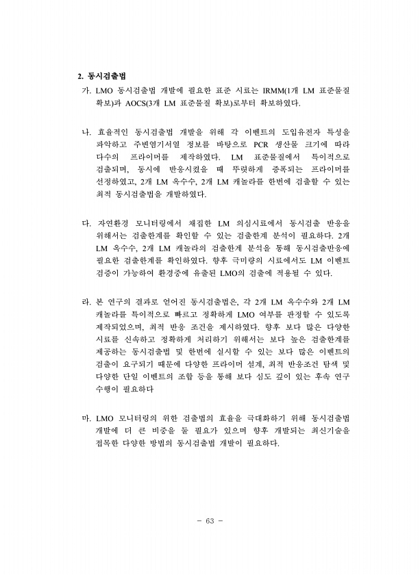 63 2. 동시검출법 가. LMO 동시검출법 개발에 필요한 표준 시료는 IRMM 1개 LM 표준물질 확보 과 AOCS 3개 LM 표준물질 확보 로부터 확보하였다. 나. 효율적인 동시검출법 개발을 위해 각 이벤트의 도입유전자 특성을 파악하고 주변염기서열 정보를 바탕으로 PCR 생산물 크기에 따라 다수의 프라이머를 제작하였다. LM 표준물질에서 특이적으로 검출되며, 동시에 반응시켰을 때 뚜렷하게 증폭되는 프라이머를 선정하였고, 2개 LM 옥수수, 2개 LM 캐놀라를 한번에 검출할 수 있는 최적 동시검출법을 개발하였다. 다. 자연환경 모니터링에서 채집한 LM 의심시료에서 동시검출 반응을 위해서는 검출한계를 확인할 수 있는 검출한계 분석이 필요하다. 2개 LM 옥수수, 2개 LM 캐놀라의 검출한계 분석을 통해 동시...