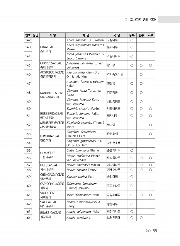 Ⅱ. 조사지역 종합 결과 55 번호 등급 과 명 학 명 국 명 동부 중부 서부 142 PINACEAE 소나무과 Abies koreana E.H. Wilson 구상나무 ○ 143 Abies nephrolepis Maxim. Maxim. 분비나무 ○ 144 Picea jezoensis Siebold & Zucc. Carri?re 가문비나무 ○ 145 CUPRESSACEAE 측백나무과 Juniperus chinensis L. var. chinensis 향나무 ○ ○ ○ 146 ARISTOLOCHIACEAE 쥐방울덩굴과 Asarum misandrum B.U. Oh & J.G. Kim 각시족도리풀 ○ 147 RANUNCULACEAE 미나리아재비과 Aconitum longecassidatum Nakai 흰진범 ○ ○ ...