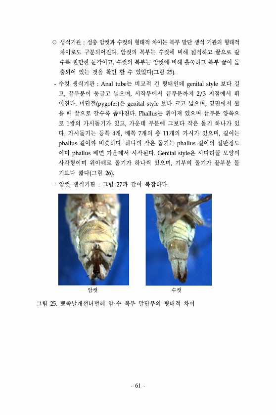 61 ○ 생식기관 성충 암컷과 수컷의 형태적 차이는 복부 말단 생식 기관의 형태적 차이로도 구분되어진다. 암컷의 복부는 수컷에 비해 넓적하고 끝으로 갈 수록 완만한 둔각이고, 수컷의 복부는 암컷에 비해 홀쭉하고 복부 끝이 돌 출되어 있는 것을 확인 할 수 있었다 그림 25 수컷 생식기관 Anal tube는 비교적 긴 형태인데 genital style 보다 길 고, 끝부분이 둥글고 넓으며, 시작부에서 끝부분까지 2/3 지점에서 휘 어진다. 미단절 pygofer 은 genital style 보다 크고 넓으며, 옆면에서 봤 을 때 끝으로 갈수록 좁아진다. Phallus는 휘어져 있으며 끝부분 양쪽으 로 1쌍의 가시돌기가 있고, 가운데 부분에 그보다 작은 돌기 하나가 있 다. 가시돌기는 등쪽 4개, 배쪽 7개의 총...