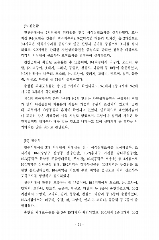 61 9 진천군 진천군에서는 2지점에서 외래생물 전국 서식실태조사를 실시하였다. 조사 지점 9-1 진천읍 건송리 백곡저수지 , 9-2 백곡면 대문리 만뢰산 총 2개점으로 9-1지역은 백곡저수리를 중심으로 인근 산림과 민가를 중심으로 조사를 실시 하였고, 9-2지역은 만뢰산 자연생태공원을 중심으로 만뢰산 전역을 대상으로 각각의 지점에서 선조사와 포획조사를 병행하여 실시하였다. 진천군에서 확인된 포유류는 총 12종이며, 9-1지점에서 너구리, 오소리, 수 달, 삵, 고양이, 멧돼지, 고라니, 등줄쥐, 청설모, 다람쥐 등 10종이 출현하였고, 9-2지점에서는 너구리, 오소리, 삵, 고양이, 멧돼지, 고라니, 멧토끼, 집쥐, 등줄 쥐, 청설모, 다람쥐 등 11종이 출현하였다. 출현한 외래포유류는 총 2종 7개체가 ...