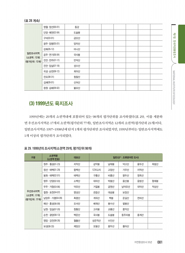 일반조사지역 소권역 12개 평가단위 12개 영월· 정선 00-01 동강 단양· 예천 02-04 도솔봉 구미 03-01 금오산 광주· 양평 05-01 양자산 강화 05-12 마니산 공주· 연기 06-04 국사봉 진안· 전주 07-17 만덕산 진안· 임실 07-18 성수산 곡성· 순천 08-12 희아산 진도 08-31 첨찰산 김해 09-01 신어산 창원· 김해 09-02 불모산 3 1999년도 육지조사 1999년에는 29개의 소권역내에 포함되어 있는 98개의 평가단위를 조사하였다 표 29 이를 세분하 면 우선조사지역은 17개의 소권역 평가단위 77개 , 일반조사지역은 12개의 소권역 평가단위 21개 이다. 일반조사지역은 19971998년에 단지 1개의 평가단위만 조사되었지만, 1999년부터는 일반조사지역에도 1...