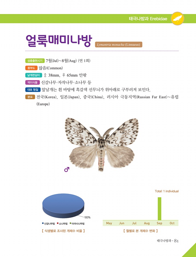 태극나방과?81 태극나방과 Erebidae 성충출현시기 7월 Jul 8월 Aug 연 1회 풍부도 많음 Common 날개편길이 ♂ 38mm, ♀ 65mm 안팎 먹이식물 신갈나무·자작나무·소나무 등 대표 형질 앞날개는 흰 바탕에 흑갈색 선무늬가 위아래로 구부러져 보인다. 분포 전국 Korea , 일본 Japan , 중국 China , 러시아 극동지역 Russian Far East 유럽 Europe 얼룩매미나방 Lymantria monacha Linnaeus 【 월별로 본 개체수 변화 】 Total1 individual 【 식생별로 조사된 개체수 비율 】 100% 신갈나무림 소나무림 아까시나무림 May Jun Jul Aug SepOct