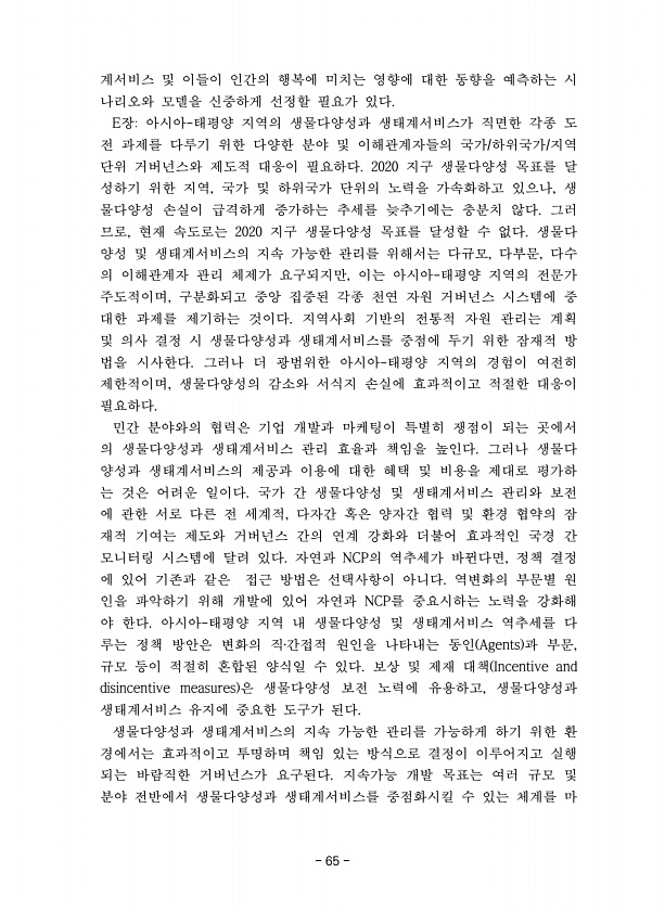 65 계서비스 및 이들이 인간의 행복에 미치는 영향에 대한 동향을 예측하는 시 나리오와 모델을 신중하게 선정할 필요가 있다. E장아시아-태평양 지역의 생물다양성과 생태계서비스가 직면한 각종 도 전 과제를 다루기 위한 다양한 분야 및 이해관계자들의 국가/하위국가/지역 단위 거버넌스와 제도적 대응이 필요하다. 2020 지구 생물다양성 목표를 달 성하기 위한 지역, 국가 및 하위국가 단위의 노력을 가속화하고 있으나, 생 물다양성 손실이 급격하게 증가하는 추세를 늦추기에는 충분치 않다. 그러 므로, 현재 속도로는 2020 지구 생물다양성 목표를 달성할 수 없다. 생물다 양성 및 생태계서비스의 지속 가능한 관리를 위해서는 다규모, 다부문, 다수 의 이해관계자 관리 체제가 요구되지만, 이는 아시아-태평양 지역의 전문가...