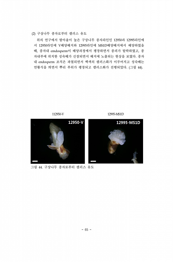 65 112950-V 12995-MS1D 그림 44. 구상나무 종자로부터 캘러스 유도 2 구상나무 종자로부터 캘러스 유도 위의 연구에서 발아율이 높은 구상나무 종자라인인 12950과 12995라인에 서 12950라인에 V배양배지와 12995라인에 MS1D배양배지에서 배양하였을 때, 종자내 emdosperm이 배양과정에서 팽창하면서 종피가 탈락하였고, 종 자내부에 위치한 성숙배가 신장되면서 배지에 노출되는 현상을 보였다. 종자 내 endosperm 조직은 파열되면서 백색의 캘러스화가 이루어지고 성숙배는 연황식을 띄면서 뿌리 부위가 팽창되고 캘러스화가 진행되었다. 그림 44