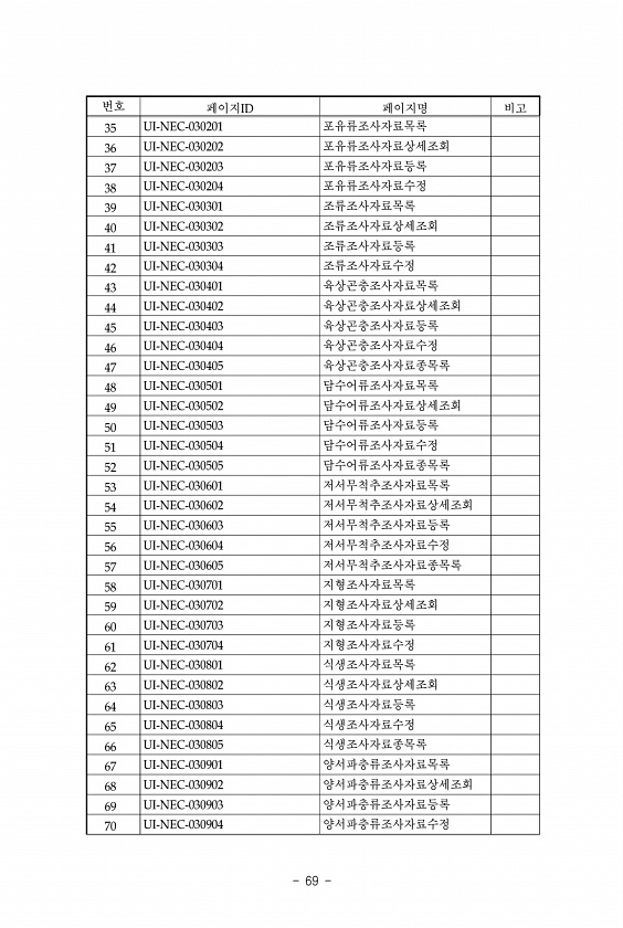 69 번호 페이지ID 페이지명 비고 35 UI-NEC-030201 포유류조사자료목록 36 UI-NEC-030202 포유류조사자료상세조회 37 UI-NEC-030203 포유류조사자료등록 38 UI-NEC-030204 포유류조사자료수정 39 UI-NEC-030301 조류조사자료목록 40 UI-NEC-030302 조류조사자료상세조회 41 UI-NEC-030303 조류조사자료등록 42 UI-NEC-030304 조류조사자료수정 43 UI-NEC-030401 육상곤충조사자료목록 44 UI-NEC-030402 육상곤충조사자료상세조회 45 UI-NEC-030403 육상곤충조사자료등록 46 UI-NEC-030404 육상곤충조사자료수정 47 UI-NEC-030405 육상곤충조사자료종목록 48 UI-NEC-030501 담수어류...