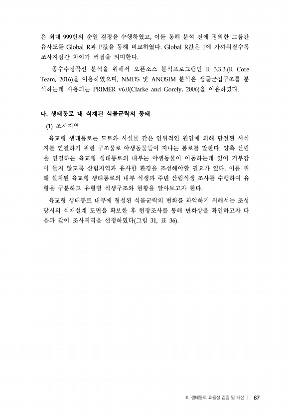 67 은 최대 번의 순열 검정을 수행하였고 이를 통해 분석 전에 정의한 그룹간 유사도를 과 값을 통해 비교하였다 값은 에 가까워질수록 조사지점간 차이가 커짐을 의미한다 종수추정곡선 분석을 위해서 오픈소스 분석프로그램인 을 이용하였으며 및 분석은 생물군집구조를 분 석하는데 사용되는 을 이용하였다 나 생태통로 내 식재된 식물군락의 동태 조사지역 육교형 생태통로는 도로와 시설물 같은 인위적인 원인에 의해 단절된 서식 지를 연결하기 위한 구조물로 야생동물들이 지나는 통로를 말한다 양측 산림 을 연결하는 육교형 생태통로의 내부는 야생동물이 이동하는데 있어 거부감 이 들지 않도록 산림지역과 유사한 환경을 조성해야할 필요가 있다 이를 위 해 설치된 육교형 생태통로의 내부 식생과 주변 산림식생 조사를 수행하여 유 형을 구...