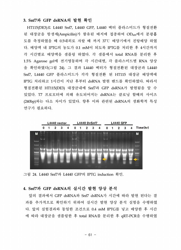 3. Snf7과 GFP dsRNA의 발현 확인 HT115 DE3 로 L4440 Snf7, L4440 GFP, L4440 벡터 플라스미드가 형질전환 된 대장균을 항생제 Ampicilin 가 함유된 배지에 접종하여 OD600에서 분광흡 도를 측정하였을 때 0.5내외로 자랄 때 까지 37℃ 배양기에서 진탕배양 하였 다. 배양액 내 IPTG의 농도가 0.1 mM이 되도록 IPTG를 처리한 후 4시간까지 각 시간별로 배양액을 샘플링 하였다. 각 샘플에서 total RNA를 분리한 후 1.5% Agarose gel에 전기영동하며 각 시간대별, 각 플라스미드별 RNA 양상 을 확인하였다 그림 24 그 결과 L4440 벡터가 형질전환된 대장균과 L4440 Snf7, L4440 GFP 플라스미드가 각각 형질전환 된 HT11...