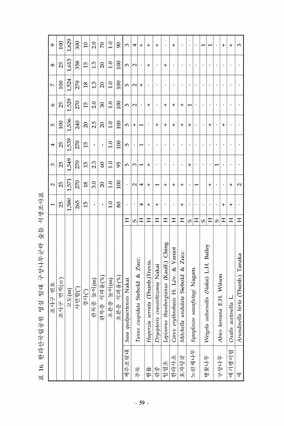 조사구 번호 1 2 3 4 5 6 7 8 9 조사구 면적 ㎡ 25 25 25 25 100 25 100 25 100 고도 m 1,580 1,571 1,549 1,539 1,536 1,529 1,524 1,615 1,629 사면향 ° 265 270 270 270 240 270 270 358 300 경사 ° 15 18 15 15 20 15 18 15 10 관목층 높이 m 3.0 2.3 2.5 2.0 1.5 1.5 2.0 관목층 식피율 % 20 60 20 30 20 20 70 초본층 높이 m 1.0 1.0 1.0 1.0 1.0 1.0 1.0 1.0 1.0 초본층 식피율 % 80 100 95 100 100 100 100 100 90 제주조릿대 Sasa quelpaertensis Nakai H · · 5 5 5 5 ...