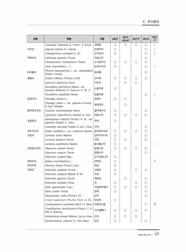 Ⅱ. 조사결과 www.nie.re.kr ? 69 과명 학명 국명 2007 2010 -2014* 2015* 2016 비고 ** Calystegia soldanella L. Roem. & Schult. 갯메꽃 ○ ○ ○ ○ Ⅰ 지치과 Argusia sibirica L. Dandy 모래지치 ○ ○ Ⅰ Lithospermum zollingeri A. DC. 반디지치 ○ ○ Ⅰ 마편초과 Callicarpa japonica Thunb. 작살나무 ○ Clerodendrum trichotomum Thunb. 누리장나무 ○ ○ ○ ○ Vitex rotundifolia L. f. 순비기나무 ○ ○ Ⅰ 파리풀과 Phryma leptostachya L. var. oblongifolia Koidz. Honda 파리풀 ○ 꿀풀과 I...