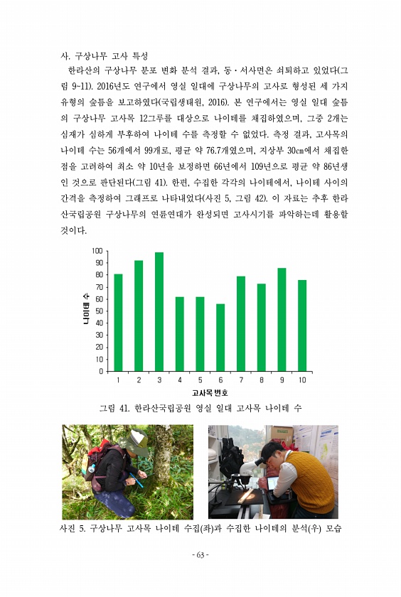사. 구상나무 고사 특성 한라산의 구상나무 분포 변화 분석 결과, 동·서사면은 쇠퇴하고 있었다 그 림 911 2016년도 연구에서 영실 일대에 구상나무의 고사로 형성된 세 가지 유형의 숲틈을 보고하였다 국립생태원, 2016 본 연구에서는 영실 일대 숲틈 의 구상나무 고사목 12그루를 대상으로 나이테를 채집하였으며, 그중 2개는 심재가 심하게 부후하여 나이테 수를 측정할 수 없었다. 측정 결과, 고사목의 나이테 수는 56개에서 99개로, 평균 약 76.7개였으며, 지상부 30㎝에서 채집한 점을 고려하여 최소 약 10년을 보정하면 66년에서 109년으로 평균 약 86년생 인 것으로 판단된다 그림 41 한편, 수집한 각각의 나이테에서, 나이테 사이의 간격을 측정하여 그래프로 나타내었다 사진 5, 그림 42 이 자...