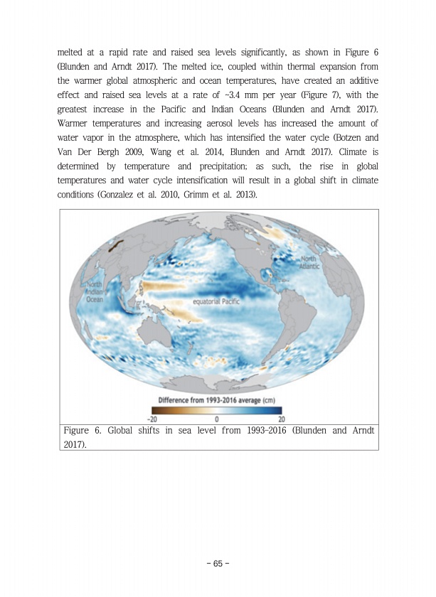 65 melted at a rapid rate and raised sea levels significantly, as shown in Figure 6 Blunden and Arndt 2017 The melted ice, coupled within thermal expansion from the warmer global atmospheric and ocean temperatures, have created an additive effect and raised sea levels at a rate of 3.4 mm per year Figure 7 , with the greatest increase in the Pacific and Indian Oceans Blunden and Arndt 2017 Warmer t...