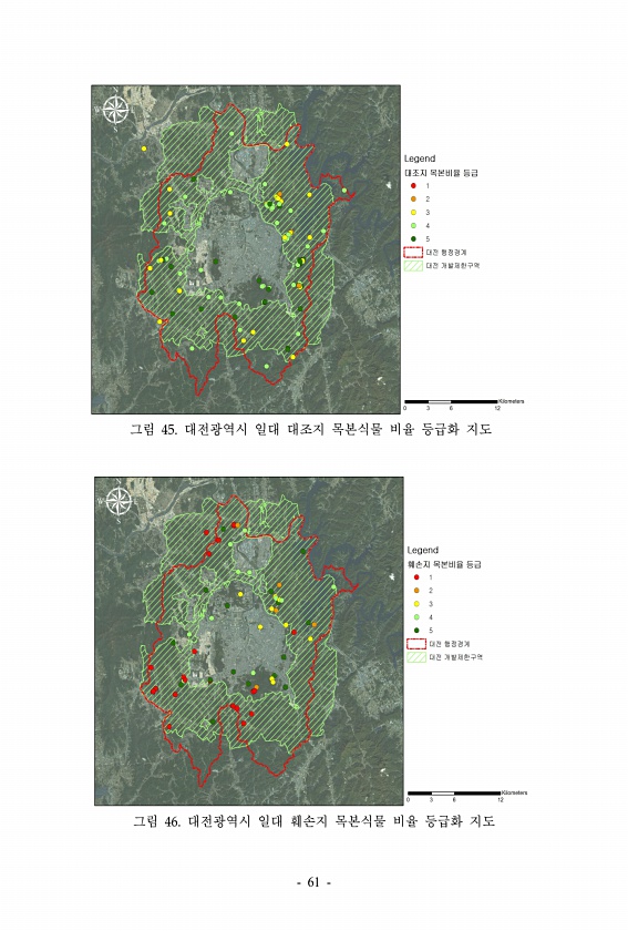 그림 45. 대전광역시 일대 대조지 목본식물 비율 등급화 지도 그림 46. 대전광역시 일대 훼손지 목본식물 비율 등급화 지도 61