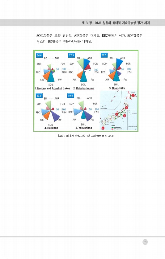 61 제 3 장 DMZ 일원의 생태적 지속가능성 평가 체계 SOIL항목은 토양 건전성, AIR항목은 대기질, REC항목은 여가, SOP항목은 장소감, BD항목은 생물다양성을 나타냄. [그림 3-8] 육상 건강도 지수 적용 사례 Natori et al, 2013