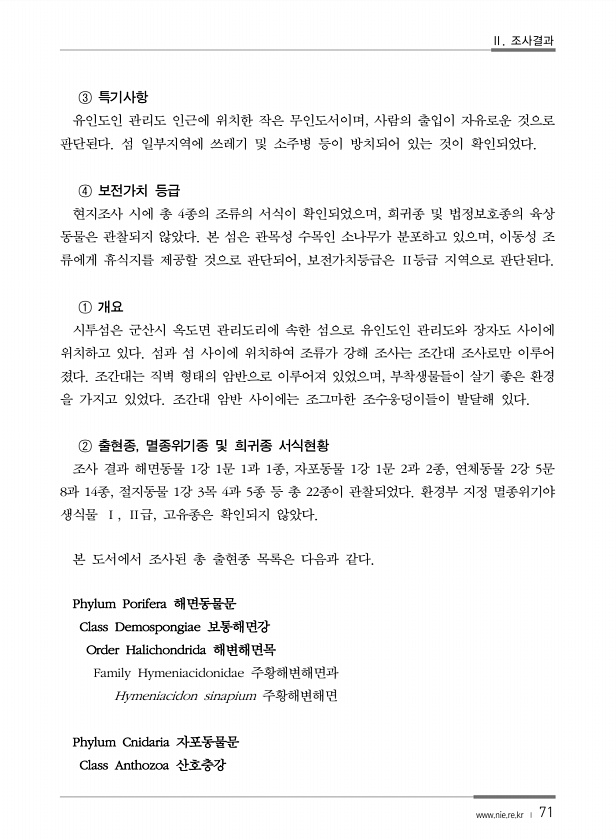 Ⅱ. 조사결과 www.nie.re.kr ? 71 ③ 특기사항 유인도인 관리도 인근에 위치한 작은 무인도서이며, 사람의 출입이 자유로운 것으로 판단된다. 섬 일부지역에 쓰레기 및 소주병 등이 방치되어 있는 것이 확인되었다. ④ 보전가치 등급 현지조사 시에 총 4종의 조류의 서식이 확인되었으며, 희귀종 및 법정보호종의 육상 동물은 관찰되지 않았다. 본 섬은 관목성 수목인 소나무가 분포하고 있으며, 이동성 조 류에게 휴식지를 제공할 것으로 판단되어, 보전가치등급은 Ⅱ등급 지역으로 판단된다. ① 개요 시투섬은 군산시 옥도면 관리도리에 속한 섬으로 유인도인 관리도와 장자도 사이에 위치하고 있다. 섬과 섬 사이에 위치하여 조류가 강해 조사는 조간대 조사로만 이루어 졌다. 조간대는 직벽 형태의 암반으로 이루어져 있었으며...