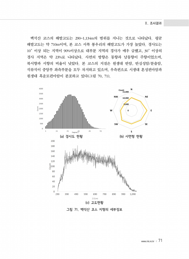 Ⅱ. 조사결과 www.nie.re.kr ? 71 백석산 코스의 해발고도는 2901,134m의 범위를 지니는 것으로 나타났다. 평균 해발고도는 약 710m이며, 본 코스 서쪽 봉우리의 해발고도가 가장 높았다. 경사도는 10°이상 되는 지역이 90%이상으로 대부분 지역의 경사가 매우 급했고, 30°이상의 경사 지역은 약 23%로 나타났다. 사면의 방향은 동향과 남동향이 주향이었으며, 북서향과 서향의 비율이 낮았다. 본 코스의 지질은 원생대 반암, 반심성암/분출암, 석류석이 중앙부 좌측부분을 모두 차지하고 있으며, 우측편으로 시생대 혼성편마암과 원생대 흑운모편마암이 분포하고 있다 그림 70, 71 a 경사도 현황 b 사면형 현황 c 고도현황 그림 71. 백석산 코스 지형의세부정보