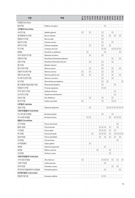 79 뒤영벌과 Bombidae 털보떡벌 Psithyrus norvegicus ○ 고치벌과 Braconidae 싸리진디벌 Aphidius gifuensis ○ ○ ○ ○ 중국명충살이고치벌 Bracon chinensis ○ ○ ○ ○ 명충살이고치벌 Bracon onukii ○ 배납작고치벌 Charmon extensor ○ ○ 흰허리고치벌 Chelonus munakatae ○ ○ ○ 먹고치벌 Cremnops atricornis ○ ○ ○ ○ ○ ○ 말총벌 Euurobracon yakohamae ○ ○ ○ 보리나방살이고치벌 Habrobracon hebetor ○ ○ 연황색고치벌 Homolobus Chartolobus infumator ○ ○ 검은고치벌 Homolobus Homolobus discolor ○ ○ ○ ...