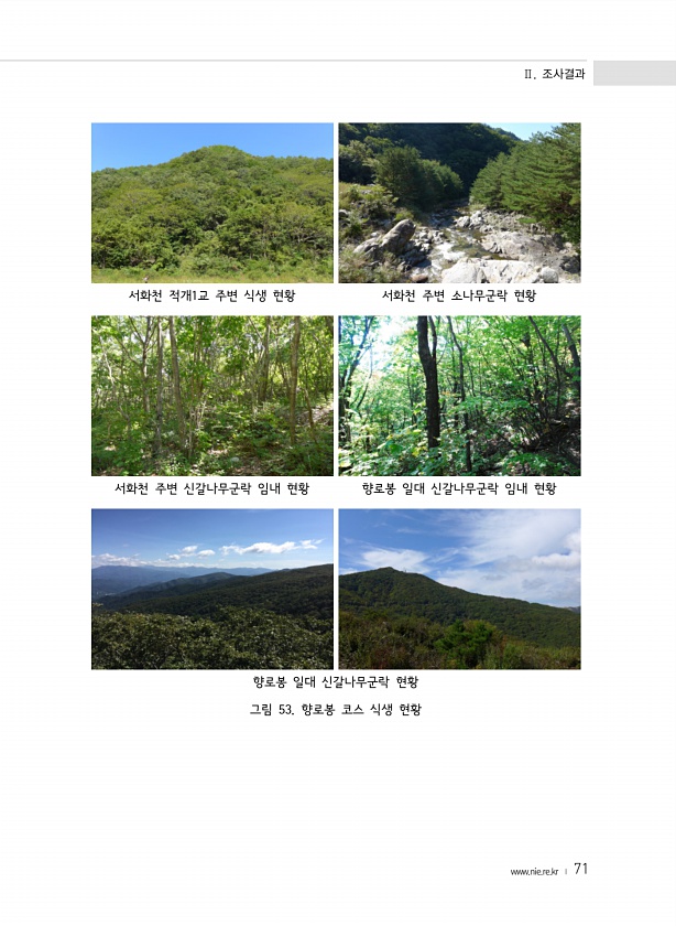 Ⅱ. 조사결과 www.nie.re.kr ? 71 서화천 적개1교 주변 식생 현황 서화천 주변 소나무군락 현황 서화천 주변 신갈나무군락 임내 현황 향로봉 일대 신갈나무군락 임내 현황 향로봉 일대 신갈나무군락 현황 그림 53. 향로봉 코스 식생현황
