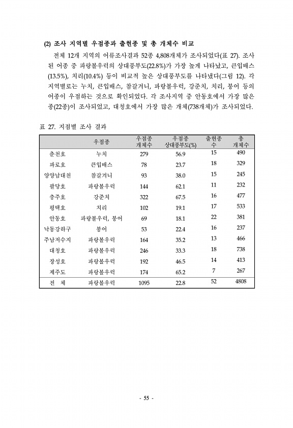 55 2 조사 지역별 우점종과 출현종 및 총 개체수 비교 전체 12개 지역의 어류조사결과 52종 4,808개체가 조사되었다 표 27 조사 된 어종 중 파랑볼우럭의 상대풍부도 22.8% 가 가장 높게 나타났고, 큰입배스 13.5% , 치리 10.4% 등이 비교적 높은 상대풍부도를 나타냈다 그림 12 각 지역별로는 누치, 큰입배스, 참갈겨니, 파랑볼우럭, 강준치, 치리, 붕어 등의 어종이 우점하는 것으로 확인되었다. 각 조사지역 중 안동호에서 가장 많은 종 22종 이 조사되었고, 대청호에서 가장 많은 개체 738개체 가 조사되었다. 우점종 우점종 개체수 우점종 상대풍부도 % 출현종 수 총 개체수 춘천호 누치 279 56.9 15 490 파로호 큰입배스 78 23.7 18 329 양양남대천 참갈겨니 93 38.0...