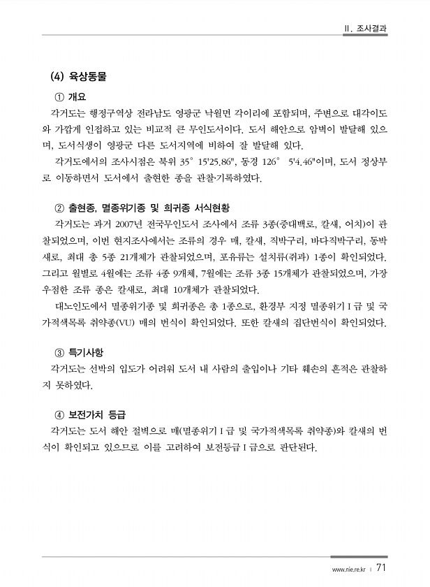 Ⅱ. 조사결과 www.nie.re.kr ? 71 4 육상동물 ① 개요 각거도는 행정구역상 전라남도 영광군 낙월면 각이리에 포함되며, 주변으로 대각이도 와 가깝게 인접하고 있는 비교적 큰 무인도서이다. 도서 해안으로 암벽이 발달해 있으 며, 도서식생이 영광군 다른 도서지역에 비하여 잘 발달해 있다. 각거도에서의 조사시점은 북위 35°1525.86, 동경 126° 54.46이며, 도서 정상부 로 이동하면서 도서에서 출현한 종을 관찰?기록하였다. ② 출현종, 멸종위기종 및 희귀종 서식현황 각거도는 과거 2007년 전국무인도서 조사에서 조류 3종 중대백로, 칼새, 어치 이 관 찰되었으며, 이번 현지조사에서는 조류의 경우 매, 칼새, 직박구리, 바다직박구리, 동박 새로, 최대 총 5종 21개체가 관찰되었으며, 포유류...
