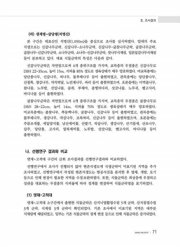 Ⅱ. 조사결과 www.nie.re.kr ? 71 라 생계령삽당령 석병산 본 구간은 대표산인 석병산 1,050m 을 중심으로 조사를 실시하였다. 일대의 주요 식생으로는 신갈나무군락, 신갈나무-소나무군락, 신갈나무-굴참나무군락, 굴참나무군락, 굴참나무-신갈나무군락, 소나무군락, 소나무-신갈나무군락, 잣나무식재림, 일본잎갈나무식재림 등이 분포하고 있다. 대표 식물군락의 특성은 다음과 같다. 신갈나무군락은 자연림으로써 4개 층위구조를 가지며, 교목층의 우점종은 신갈나무로 DBH 2235cm, 높이 15m, 식피율 85% 정도로 생육상태가 매우 양호하였다. 아교목층에는 당단풍나무, 신갈나무, 피나무, 물푸레나무 등이 출현하였고, 관목층에는 당단풍나무, 산철쭉, 생강나무, 까치박달, 노린재나무, 싸리 등이 출현하였으며...