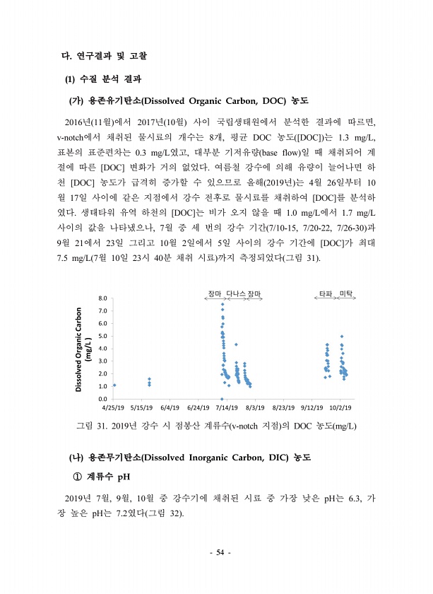 54 1 Dissolved Organic Carbon, DOC 2016 11 2017 10 , v-notch 8 , DOC [DOC] 1.3 mg/L, 0.3 mg/L , base flow [DOC] [DOC] 2019 4 26 10 17 [DOC] [DOC] 1.0 mg/L 1.7 mg/L , 7 7/10-15, 7/20-22, 7/26-30 9 21 23 10 2 5 [DOC] 7.5 mg/L 7 10 23 40 31 31. 2019 v-notch DOC mg/L Dissolved Inorganic Carbon, DIC ① pH 2019 7 , 9 , 10 pH 6.3, pH 7.2 32