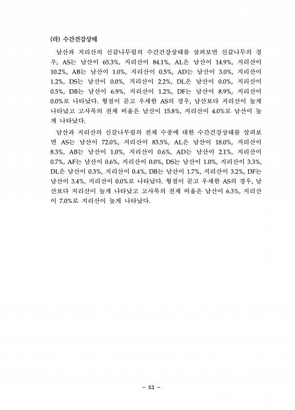 53 라 수간건강상태 남산과 지리산의 신갈나무림의 수간건강상태를 살펴보면 신갈나무의 경 우, AS는 남산이 65.3%, 지리산이 84.1%, AL은 남산이 14.9%, 지리산이 10.2%, AB는 남산이 1.0%, 지리산이 0.5%, AD는 남산이 3.0%, 지리산이 1.2%, DS는 남산이 0.0%, 지리산이 2.2%, DL은 남산이 0.0%, 지리산이 0.5%, DB는 남산이 6.9%, 지리산이 1.2%, DF는 남산이 8.9%, 지리산이 0.0%로 나타났다. 형질이 곧고 우세한 AS의 경우, 남산보다 지리산이 높게 나타났고 고사목의 전체 비율은 남산이 15.8%, 지리산이 4.0%로 남산이 높 게 나타났다. 남산과 지리산의 신갈나무림의 전체 수종에 대한 수간건강상태를 살펴보 면 AS는 남산이 72.0%...