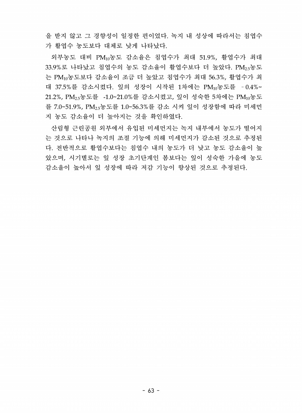 63 을 받지 않고 그 경향성이 일정한 편이었다. 녹지 내 성상에 따라서는 침엽수 가 활엽수 농도보다 대체로 낮게 나타났다. 외부농도 대비 PM10농도 감소율은 침엽수가 최대 51.9%, 활엽수가 최대 33.9%로 나타났고 침엽수의 농도 감소율이 활엽수보다 더 높았다. PM2.5농도 는 PM10농도보다 감소율이 조금 더 높았고 침엽수가 최대 5O.3%, 활엽수가 최 대 37.5%를 감소시켰다. 잎의 성장이 시작된 1차에는 PM10농도를 ?0.4%21.2%, PM2.5농도를 -1.021.0%를 감소시켰고, 잎이 성숙한 5차에는 PM10농도 를 7.051.9%, PM2.5농도를 1.05O.3%를 감소 시켜 잎이 성장함에 따라 미세먼 지 농도 감소율이 더 높아지는 것을 확인하였다. 산림형 근린공원 외부에서 유입된...