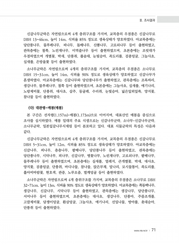 Ⅱ. 조사결과 www.nie.re.kr ? 71 신갈나무군락은 자연림으로써 4개 층위구조를 가지며, 교목층의 우점종은 신갈나무로 DBH 1346cm, 높이 14m, 식피율 85% 정도로 생육상태가 양호하였다. 아교목층에는 당단풍나무, 물푸레나무, 피나무, 돌배나무, 산뽕나무, 고로쇠나무 등이 출현하였고, 관목층에는 철쭉, 노린재나무, 미역줄나무 등이 출현하였으며, 초본층에는 조릿대가 우점하였으며 개별꽃, 박새, 단풍취, 풀솜대, 눈빛승마, 족도리풀, 검종덩굴, 그늘사초, 실새풀, 은방울꽃 등이 출현하였다. 소나무군락은 자연림으로써 4개의 층위구조를 가지며, 교목층의 우점종은 소나무로 DBH 1531cm, 높이 14m, 식피율 90% 정도로 생육상태가 양호하였고 신갈나무가 혼생하였다. 아교목층에는 신갈나무와 ...