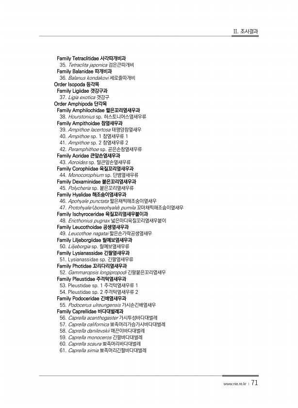II. 조사결과 www.nie.re.kr ? 71 Family Tetraclitidae 사각따개비과 35. Tetraclita japonica 검은큰따개비 Family Balanidae 따개비과 36. Balanus kondakovi 세로줄따개비 Order Isopoda 등각목 Family Ligiidae 갯강구과 37. Ligia exotica 갯강구 Order Amphipoda 단각목 Family Amphilochidae 짧은꼬리옆새우과 38. Hourstonius sp. 허스토니어스옆새우류 Family Ampithoidae 참옆새우과 39. Ampithoe lacertosa 태평양참옆새우 40. Ampithoe sp. 1 참옆새우류 1 41. Ampithoe sp. 2 참옆새우류 2 42. Peramp...