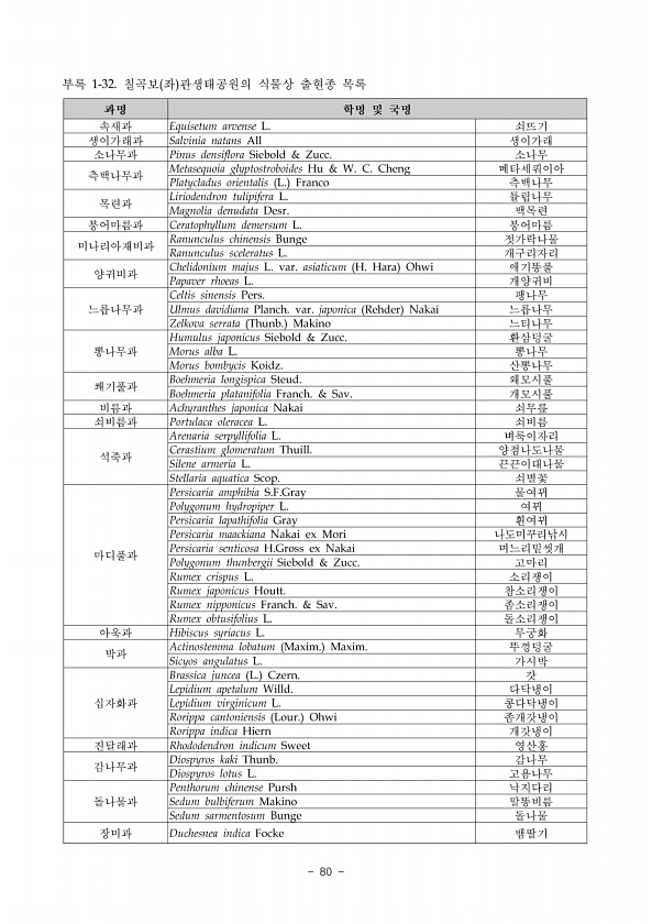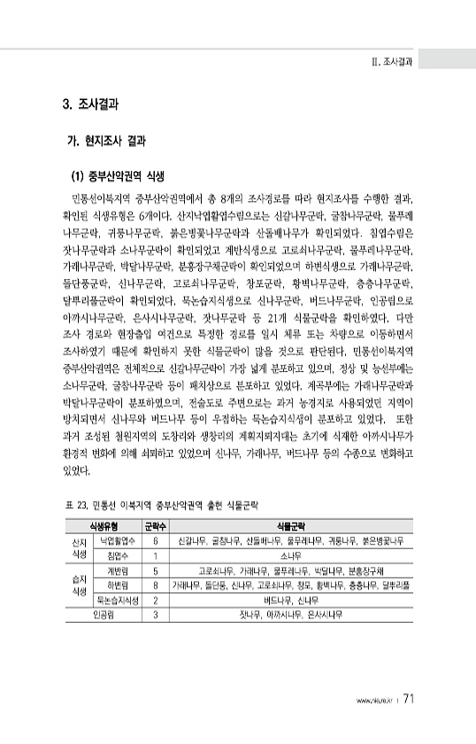 Ⅱ. 조사결과 www.nie.re.kr ? 71 3. 조사결과 가. 현지조사 결과 1 중부산악권역 식생 민통선이북지역 중부산악권역에서 총 8개의 조사경로를 따라 현지조사를 수행한 결과, 확인된 식생유형은 6개이다. 산지낙엽활엽수림으로는 신갈나무군락, 굴참나무군락, 물푸레 나무군락, 귀룽나무군락, 붉은병꽃나무군락과 산돌배나무가 확인되었다. 침엽수림은 잣나무군락과 소나무군락이 확인되었고 계반식생으로 고로쇠나무군락, 물푸레나무군락, 가래나무군락, 박달나무군락, 분홍장구채군락이 확인되었으며 하변식생으로 가래나무군락, 돌단풍군락, 신나무군락, 고로쇠나무군락, 창포군락, 황벽나무군락, 층층나무군락, 달뿌리풀군락이 확인되었다. 묵논습지식생으로 신나무군락, 버드나무군락, 인공림으로 아까시나무군락, 은사시나무군락, 잣나무군...