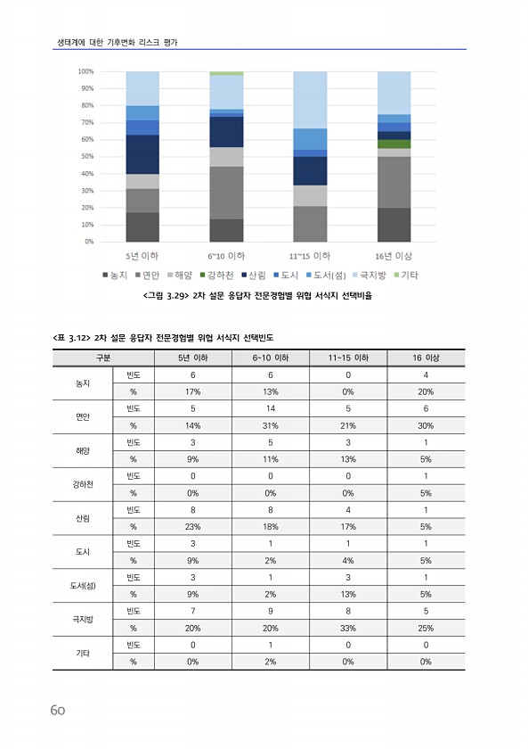 생태계에 대한 기후변화 리스크 평가 60 구분 5년 이하 610 이하 1115 이하 16 이상 농지 빈도 6 6 0 4 % 17% 13% 0% 20% 연안 빈도 5 14 5 6 % 14% 31% 21% 30% 해양 빈도 3 5 3 1 % 9% 11% 13% 5% 강하천 빈도 0 0 0 1 % 0% 0% 0% 5% 산림 빈도 8 8 4 1 % 23% 18% 17% 5% 도시 빈도 3 1 1 1 % 9% 2% 4% 5% 도서 섬 빈도 3 1 3 1 % 9% 2% 13% 5% 극지방 빈도 7 9 8 5 % 20% 20% 33% 25% 기타 빈도 0 1 0 0 % 0% 2% 0% 0% 표 3.12 2차 설문 응답자 전문경험별 위협 서식지 선택빈도 그림 3.29 2차 설문 응답자 전문경험별 위협 서식지선택비율