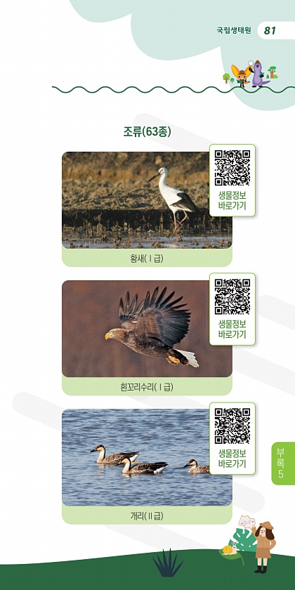 81 조류 63종 황새 Ⅰ급 흰꼬리수리 Ⅰ급 개리 Ⅱ급 생물정보 바로가기 생물정보 바로가기 생물정보 바로가기 부 록5