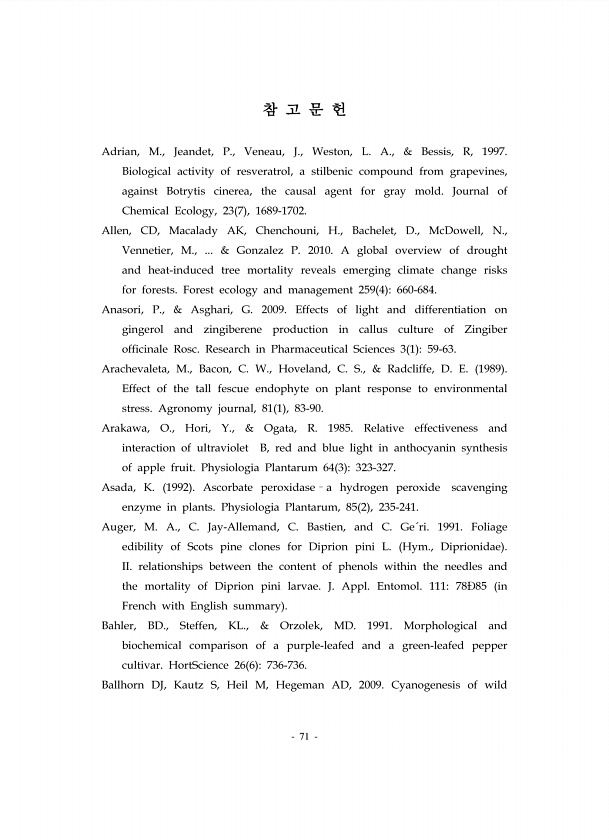 71 참 고 문 헌 Adrian, M., Jeandet, P., Veneau, J., Weston, L. A., & Bessis, R, 1997. Biological activity of resveratrol, a stilbenic compound from grapevines, against Botrytis cinerea, the causal agent for gray mold. Journal of Chemical Ecology, 23 7 , 1689-1702. Allen, CD, Macalady AK, Chenchouni, H., Bachelet, D., McDowell, N., Vennetier, M., ... & Gonzalez P. 2010. A global overview of drought and...